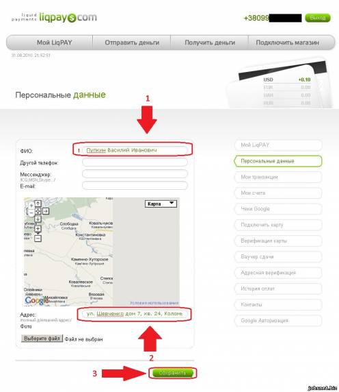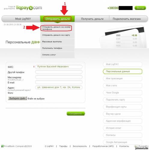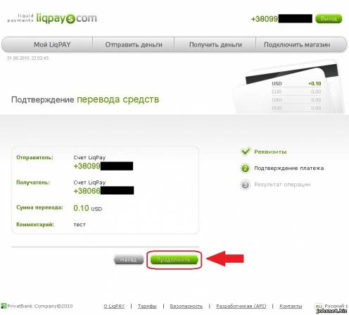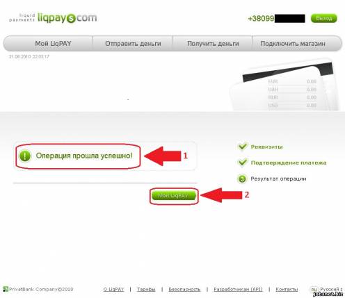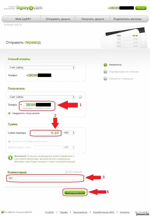 ![]() После успешного сохранения данных (рис. 6) наводим курсор мыши на вкладку Отправить деньги (цифра 1), из выпадающего меню выбираем пункт Отправить деньги на номер телефона (цифра 2) и, естественно, кликаем по нему. ![]() Откроется следующая страница (рис. 7), где в секции Получатель: в поле Телефон: вводим номер телефона получателя (цифра 1), в секции Сумма: в поле Сумма перевода: вводим желаемую сумму перевода (цифра 2), в поле Комментарий: вводим какой-либо комментарий (до 40 символов, цифра 3), после чего нажимаем кнопочку Подтвердить (цифра 4). ![]() После чего откроется страница подтверждения, где, убедившись в корректности введенных данных, нажимаем Продолжить (рис. 8). ![]() Открывшаяся страница (рис. 9) сообщит нам об успешном завершении операции (цифра 1), после чего, нажав кнопку Мой LiqPAY, смело переходим в свой аккаунт. При этом с Вашего счета будет снята нужная сумма, а на Ваш телефон и телефон получателя придут SMS, подтверждающие соответственно отправку и прием денег. Вот и все! ![]() Источник: http://jobsnet.biz/publ/15-1-0-44 | |